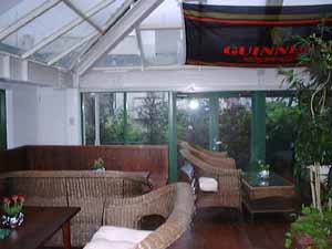 温室のように光がはいる大きな窓に、座りやすい籐のイスが並び、