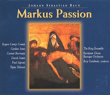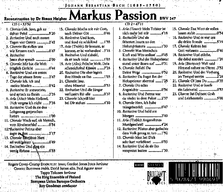 J.S.Bach(一応)の『マルコ受難曲』(と別稿で紹介する『ルカ受難曲』)。しかも輸入盤8枚組みでなんと¥2600という超お買い得盤!!。これが何故珍しいかというと、今日では共に「偽作」とされていて、マタイ、ヨハネが数十種類のCDをカタログに数えるというのに、現在(恐らく今後も)カタログに全く見当たらないです。以前はごくたまにコンサートやLPレコードもあるにはあったのですが、奇麗な曲にもかかわらず、今日(と将来も)聴くことは絶望的と思われていた(?)のです。その上これはオリジナル古楽器による演奏でなのです。