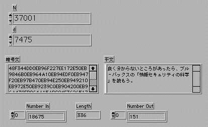 復号の場合は、公開鍵Nと秘密鍵dを入力し、通信文を"暗号文"に入れて実行する。