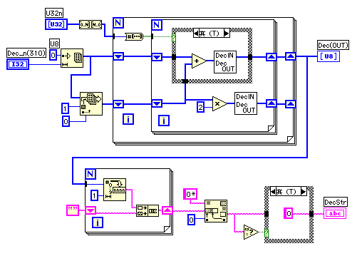 - ダイアグラムに訳の分からないDecInDecOutというサブVIが入っているが、とりあえず無視してDec(OUT)という出力に注目しよう。2重ループはU32nというU32の1次元配列をDec(OUT)というU8の1次元配列に変換するものだ。Dec(OUT)は10進数の位ごとの数値(0〜9)で配列の0番目が1の位になっている。Dec(OUT)を一つづつストリングに変換して、先頭に連なる0を取り除くと目的の変換が終了する。