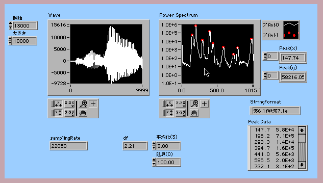 これらを使ってパワースペクトルのピークを検出するVIを作ってみよう。