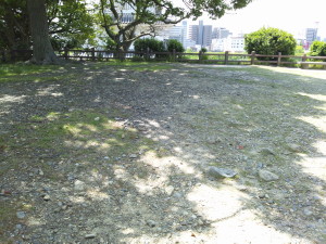 二つの櫓は、向かって右が『巽櫓(たつみやぐら)』、左が『坤櫓(ひつじさるやぐら)』といいます。巽も坤も方角を表していて、その櫓のある方角の名前がつけられているのです。同じような造りに見えますが、坤櫓のほうがやや大きいようです。 お城の正面は広場になっていますが、かつてはここにもいろいろな通路や土塀があったと思われます。攻め込んでいざ本丸へ、という時に正面にどーんと控えているのが二つの大きな櫓ということでしょう。 などと考えながら、向かって左手から本丸の側面へと回ります。 お城は今は公園ですので、野球場などもあります。高校野球兵庫県大会でよく使われる明石公園野球場、のはずですが、今は名前が変わっているようです(関係ありませんが、私は野球も好きです)。 側面に回ると、石垣がよく見えました。打ち込み接ぎ明石城はシンプルな造りのようで、石垣のラインは入り組んではいません。階段を上って本丸内へ上がります。