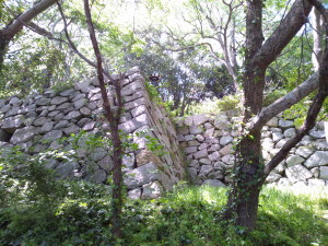 本丸内に入ると、鬱蒼と木の繁った中に、横矢が掛かるようにへこんだ一角がありました。その石垣を見ると、打ち込み接ぎ(うちこみはぎ)の為、石に出っ張りが多く、また隙間もあってなんだか昇れそう・・・。高さも4、5メートルほどなので、さんざん迷った挙句登ろうと決めました。高いところが怖いので下は絶対見ないということも同時に決めました。周りに誰もいなさそうなところですが、散歩している人もちらほら見かけたので、上には誰か歩いているかもしれない。その時は笑ってごまかそうということも決めました。 大した高さではないのですが、必死になって登り、何とか石垣の上に身体が出たときは心臓がドキドキしていました。残念ながら、石垣の上にはちょうど通りかかった人がいましたが、見て見ぬ振りをしてくださったので笑ってごまかさずにすみました。 私でも登れたのですから、おそらく石垣そのものは熟練した兵士や忍びの者であれば、よじ登ることはそれほど難しいことではなかったと思います。ですが石垣の上には土塀があり、そこから銃や弓矢で撃たれるわけですから実際には強力な守りの壁だったのです。私も当時であれば横矢に掛かり、蜂の巣にされて下に落ちていたに違いありません。 城の側面から正面に回ります。ちょうど大手口を入ったところで見た、大きな櫓と土塀のすぐ下を歩きます。見上げれば櫓ははるか上方にありました。土塀には狭間がありますが、石垣の真下に取り付くと死角になり、火縄銃などではうまく照準がつかないのではと感じます。櫓の下の石垣が二段になっていました。その代わりに二段の石垣にの上に作られた、より近い狭間で狙うというわけでしょう。