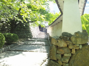 下のほうでは石垣がすぐ近くで見えました。石垣は打ち込み接ぎ(うちこみはぎ)と呼ばれ、石垣としては最もポピュラーなものです。大まかに形を整えた石を積み、隙間に小さな石を詰めることからそう呼ばれています。「迫力のある石垣ですね」ととエレベーターで一緒になった研究員らしき男性に話しかけると、「付近の石質は柔らかいため、ほかの城に比べて石垣の石の大きさは全体的に小さいんです」が説明してくれました。(写真の石垣は外に出てから撮ったものです) 本丸を離れ、西の丸へ向かいます。その間もいくつかの門があり、狭間に囲まれた通路はせまく曲がり、ただ歩くだけでも大変なのに鉄砲玉が飛ぶ中を攻めることになれば、臆病な私などは足がすくんでしまいそうな気がします(反対に「ひるむな!この卑怯者めが」と味方の武将に斬られそうですけどね)。 西の丸には長局といって、奥方や女中など女性が住んでいた場所がありました。長い廊下状の建物となっていて、廊下沿いに部屋が並んでいます。外は城外の山々が見え、内はあの優美な天守付近が一望でき非常に眺めのいいところです。木造の趣ある造りで、また風通しもよく心地よい空間でした。