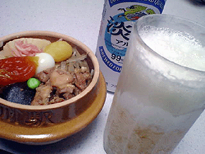 涙の土曜出勤日・・。昼は例によって大手町ビル「リトル小岩井」で“定番”スパゲティ・バジリコとキャベツ酢漬けの別盛り、計610円。夕食は、久しぶりに三枝子さん特製ピザ、ポテトサラダ、煮物(蒟蒻、さつま揚げ、竹輪、人参)、炒飯、ロング缶2つ&焼酎お湯割り=写真。だれ?カロリーオーバーとちゃう?と疑っているのは?