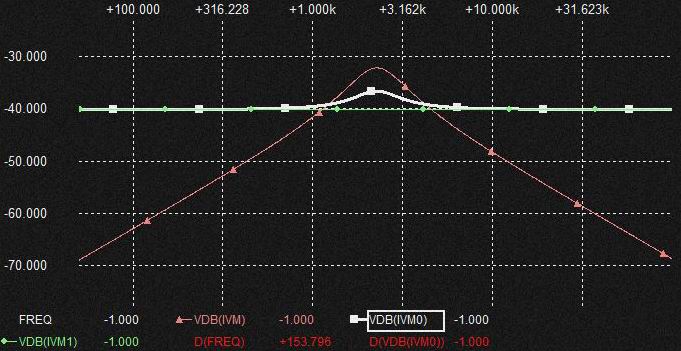 0.02uFの Cap.を流れる電流は棚部分がとれて普通のQの大きい2次HPF特性になるのでそれを積分したCap.の電圧特性はQの高いBPF特性になります。 棚部分の電流がVCRに流れるということでしょうか。 またFc以降の帯域でGAINが上昇しています。