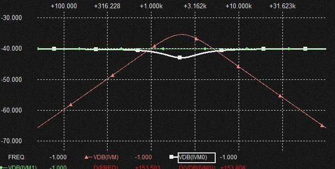 GmF1の入力やGmF1の電流出力まわりは基本フラットな入力信号電圧とLPF特性、HPF特性の電流MIXとなるのでMIX後は基本逆特性のfilter特性が出現します。 さらにこの場合両者の電流レベルがそろっていないので棚型部分が発生します。 この棚型部分は最終的な2次HPFでは消えています。