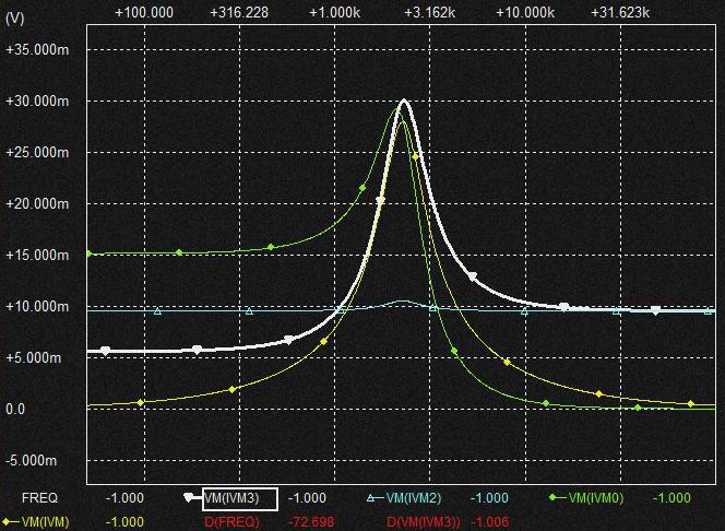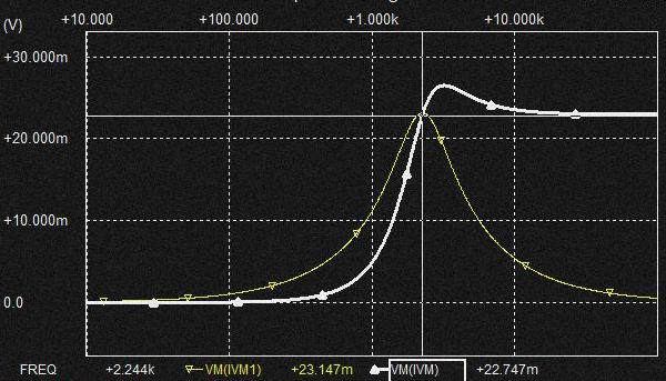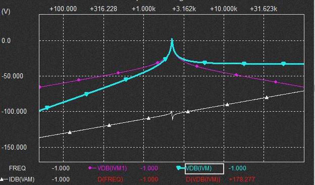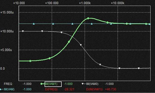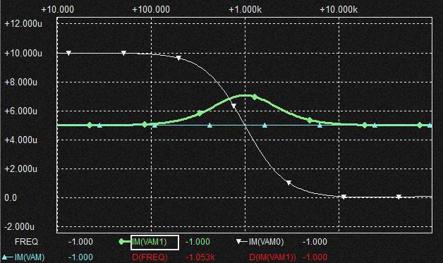 0.02uFの Cap.を流れる電流は上記と同様棚部分がとれてLPFからHPFに変化しており上図ではわかりにくいですがSlopeは2次特性になるのでCap.電圧はQの低いBPF特性となります。
