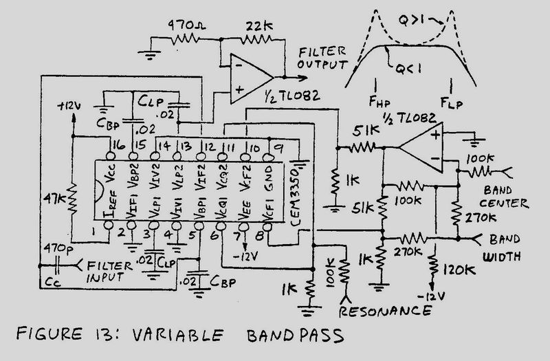 本質的にはOP AMPの SVFと同じ構造ですが、OP AMPの方は入力段の信号MIXに際してSIG INのFc付近での GAIN低下をBPF出力を逆相で戻しているのに対してCEM3350では積分器のBPF特性発生直前の部分で行うという違いがあります。