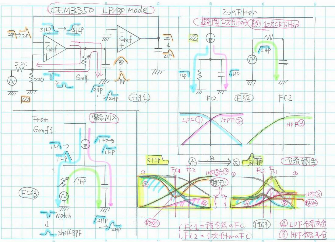 1:GmF1の定電流源はVCRと0.02uFのCap.により構成される定電流入力型の1次Filterに対して R(LPF特性)とCap.(HPF特性)のインピーダンス比で分流。