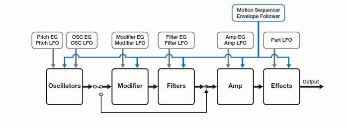実際Sourceは41個、 0 Pitch Bend 1 Modulation Wheel 2 After Touch 3 Foot Controller 1/2 5 Foot Switch 6 Ribbon Controller 1 7 Breath Controller 8 Assignable Knob 1/2/3/4/5/6/7/8 16 Super Knob 17 Assignable Switch 1 /2 19 Motion Seq(MS Lane) 1 / 2 / 3 /4 23 Envelope Follower 1 .. 16 39 Envelope Follower A/D 40 Envelope Follower Master * 他社ではよくある KEY(Tracking)が無い。(固定Mod.としてついているModule もあるにはあるが) * EG/LFOは固定で各Moduleに設置されているのでMod. Souceにはないのがなんとも。 すなわちOSC/Noiseの出力を簡単にEGでcontrollできない。FMのmod Leveも同様。 下記のようにDistinationには各OutPUTはある。ちょとした所にもdefaultでEG がかけられるのに。ということはMatrix Mod.に対する設計思想が普通と違うのか Power配分等の問題か?。* SourceにMIDI CC等はないですがControl NumberPageでRibbon、Konb等を自由にMIDI CCに割り当てることができます。MIDI IN / OUT共に再設定SWにreMapされます。 外部MIDIを使う場合は自由にMIDI CCに割り当てられますが本体のみで使用する場合は当然上記の41個のSourceのみです。