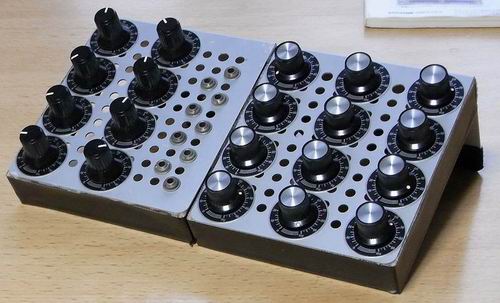 上の写真は doepferのA110VCOの回路をコピーしたものです。 Volumeは3段、jackは2段で SWが1段です。 jackは余裕があるようにすきまをあけました。 目盛り板は古くから秋葉に売っていてよく昔のラジオなどの製作記事で使われており当時は格好の悪い古びたデザインに見え好きではなかったです。 90年代に秋葉のヒロセ無線が閉店した際に特価で10個100円で売っていたので何かに使えないかと多目に購入したものです。 普通に買うと1個100円以上しますが安価だったので気軽に使えます。 つまみとのデザインが合えばこのようになにも化粧していないパネルでもそこそこ見られるパネルになります。 またこのトレイをサブパネルとして後日、化粧板をつけてもいいでしょう。 トレイの筐体へのマウントもL型のアルミアングルで連結できます。 ダイソーの商品は移り変わりが速いので売れないものはすぐディスコンになってしまい、上記トレイもすぐになくなりましたが(2005年で消滅)それを見越していくつも保有しているので10module程度のmodularならこれで構成できます。 同じころに穴のいっぱいあいたアルミのブックスタンドと言うものもダイソーで売られていました。 これも同じくsynth module等には有用に思えます。 ダイソーといえば 桐の枡も色々に使えて有用なのですが最近見かけません。 細い木枠を追加してスラントスタイルなパネルにしてみました。 これを利用して小型のsynthを作ってみたいものです。 と思いながら早、10数年たってしまいました。
