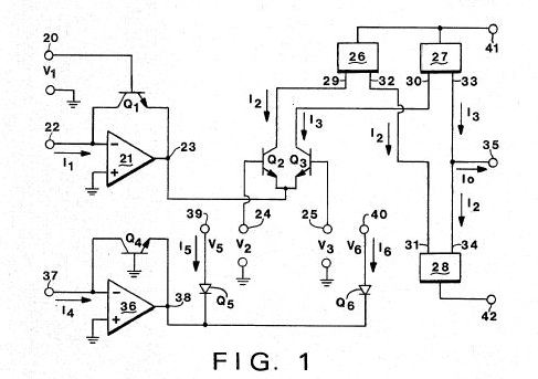 上図のようにウィルソンカレントミラー(CM)がベースです。右図のように2個並べて43と44の端子にCapactorを置きます。43と44がfilterのInputで42と45がfilterのoutPutでOutPutを次段のFilter Stageにつなげるイメージで全体像としてはLadder Filterを構成。MOOG Tr.Ladder VCFと同様の定電流入力の並列型1次LPFということです。Tr. Ladderの場合と同様にエミッタの微分抵抗とCap.が並列接続で両者のインピーダンスによってAUDIO信号の分流比がきまり1次LPFが構成されます。両(CM)のinput側のコレクタ電流の変化が出力側の電流にコピーされます。入力と出力電流が同じ方向になっているのでわかりにくいです。カレントミラー(CM)なので入力側のTr.のコレクタ電流がもう片側のコレクタ電流としてコピーされた定電流となるのでOUT側は次段の負荷に対してBuffer効果が出ます。