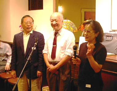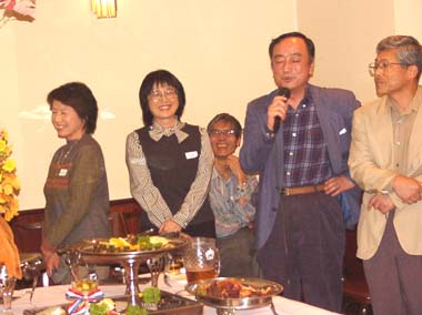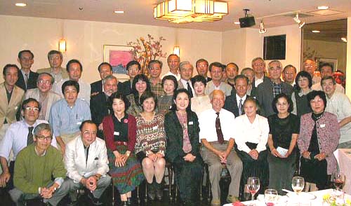 「近辻さんを囲む会」日 時: 平成15年9月23日18:00〜20:30会 場: 銀座ライオン・松坂屋別館店 (囲む会・参加者:40名) 35年卒:神保エミ子 37年卒:小高祥宏 38年卒:上野尚博 39年卒:追川 滋,井上英明 40年卒:近辻宏帰,遠藤建治,渡辺尚代 41年卒:川島 武 42年卒:竹川昭三,奥村安隆,高野凱夫 赤石智子,羽金勝子,小林佐智子 43年卒:冨山 稔 44年卒:酒井正敏,酒井直子,北川淑子 谷口高司,高橋隆一,斎藤孝男 阿部 修,岡田紘一 45年卒:末谷勝則,志賀瑞枝 46年卒:上野晶博,石川敏男,大野克美 四宮明雄,傳 順一 47年卒:大熊裕子 50年卒:日比 彰,真柳 元,宮崎大志郎, 浅井明登,玉川和彦 51年卒:藤原郁久,後藤裕子 61年卒:井上祐治 (写真説明) 右上:近辻さんたち40年卒の挨拶。 右 :酒井夫妻たち44年卒の挨拶。 下 :参加者全員で記念撮影 |