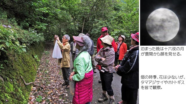 2017年10月5日(木)〜6日(金) 「50年ぶりの丹沢札掛合宿」と称して、1965年当時に同好会の3年から1年だったOBに呼びかけ、札掛の丹沢ホームで1泊。 養魚場や栄光ヒュッテの見学や、折からの十六夜の月を見上げて夜の林道歩き。鹿の声を求めて一ノ沢峠付近まで往復など。残念ながら鹿の声は雌の警戒温のみで、雄鹿の長く引く鳴き声は聞けなかった。 | |
