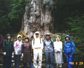 98年度の旅行会は、世界自然遺産に登録されて人気の高まった屋久島を、8月28日から30日までの3日間訪問した。 日本列島は前線が台風で刺激されて、各地で豪雨が続いていたが、屋久島は天気に恵まれ、行動中は2日目の縄文杉を見て下る途中に、屋久島名物の雨にみまわれた程度で済んだ。 縄文杉まで往復10時間歩く登山には2日目に全員でトライし、一人の落ちこぼれもなく縄文杉を見ることができた。縄文杉、大王杉をはじめとする巨木の森に、皆圧倒される。 屋久杉だけでなく、ヒメシャラの大木や滝の流れ落ちる花崗岩の一枚岩など、島とは思えないスケールの大きな景観の連続であった。 久しぶりの長時間の山歩きの結果、縄文杉にもめぐり会え、自分の体力にも自信がもて、充実感いっぱいの旅となった。 | |
