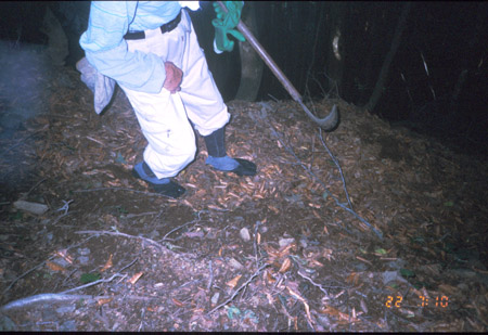 使い込まれて鈍く光る下草刈りの鎌の柄と,地下足袋に”はばき”の組み合わせがプロフェッショナルを感じさせます。腰の曲がり具合や,よく鍛えられた手の甲の感じから,ご高齢の方と思われます。 こちらは長靴です。私も愛用していますが,蒸れることを除けば,はき慣れると最高です。特にスパイク付きのものは,冬の凍った急斜面で実に好都合です。