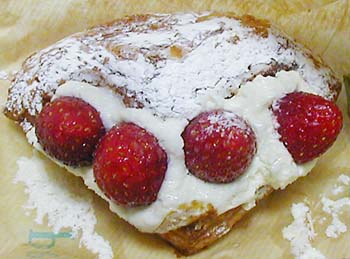 お店の中に入って一番、気になった商品です。パイに近いデニッシュがお気に入り、生地の中にはたっぷりの生クリーム。甘酸っぱいいちごが合います。たっぷりの粉砂糖がまた良い感じです。生地に対してクリーム&いちごの量が多いのも好み。また買いにいっちゃいそうです。