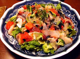 大皿に地アジ、メジマグロ、カンパチ、スミイカなど地魚と地野菜のサラダ。地アジは、肉厚なのに臭みはまったくなくするりと入っていきます。