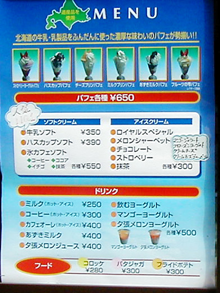 雪印パーラーのメニュー