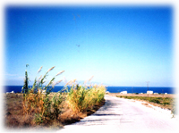 13イア-街を散策 10月2日(旅11日目) 朝食と昼食のサンドイッチとデザートをセットにして、私はいつも夕方だけ行くイアの街に、午前中から行くことにした。今日はイアの街で、のんびりする予定。 イアのバス停を降りると、いつもは海に向かって歩き、つきあたったら右折する。道の両側にはおみやげ物屋、ギャラリー、洒落たカフェなどが、続く。今日は突き当たりを左に歩くことにした。 少し淋しい道だが、歩いて行くと、青い屋根の美しい教会のある広場を見つけた。今日はとても良い天気なので日差しが強い。軽食とシエスタをとるためのちょうど具合のいい石のベンチを見つけたので、そこでボーっとしていると、斜め前にアツアツのカップルを発見。本当にこの島はミコノス島、同様、アツアツのカップルが多い。 私は熱さにまかせ、ゴロリと石のベンチの上に横たわった。ベンチはヒヤリと冷たくてとても気持ちが良く、すぐに眠りに入ってしまった。 日が傾き、顔にちょうど日があたり、私は眩しさで目が覚めた。目の前にはちょこんと白猫がぎょうぎよく、座って私を見ていた。私はちょうどお腹がすいてきたので猫と昼食をとることにした。サンドイッチを食べていると、先ほどのカップルがチラッチラッとこっちを気にしだした。愛だけではお腹一杯にはならないらしい。彼等も持参してきた昼食を食べだした。すると、すっかり食事をすませ何も無くなった私を置いて、猫はちゃっかり、カップルに向かってすりよった。やっぱり猫は何処の国でも一緒だなと、感心したり、あきれたりして、また一眠りすることにした。 15時近くになっていくらかは日が弱くなった。そろそろ、歩き出すことにしよう。いつも夕日を見にいくイアの海は断崖絶壁の海。反対側には遠浅の海岸線が続く。私は今朝、海岸に立てなかったこともあって、ビーチに向かい歩き出した。道はずっと1本道で遠くまで続いていた。これなら迷うことはないだろう。歩いて行くと、ROOM TO RENTの建物がぽつん、ぽつんと建っている。中を見せてもらったがここらへんまで来ると、値段が安くて、部屋は広くてきれい。窓からの景色もきっときれいなんだろうな。でも車やバイクが無いと不便に違いない。道の両側には巨大なすすきがゆれている。羊が3匹ゴロリと横になっていた。 歩き始めて1時間30やっと海が近くになった。海岸に立ってみると、白い紙のような繊維の海草?のようなもので一面覆われていた。いったいこれはなんなんだ?私は使い古しのトイレットペーパーでないことだけを祈りしばらく歩いてみた。海は相変わらず青かったが、海岸にはペットボトルなどのゴミがたくさんあって、少しがっかりした。海岸は砂ではなくて岩とじゃりでできていた。ところどころに赤い岩があった。 レッドビーチは本当に赤いのかな…?少し疲れ気味でどこにもいきたく無くなってきたが私は急にレッドビーチが見たくなった。明日、行ってみよう。私は波の音が聞けたことに満足して、戻ることにした。「また来た道を帰るのか…。」気が遠くなりそうだった。しばらく歩くと前をカップルが歩いていた。が前の2人も疲れている様子で、そのうち、彼女の方は車が来ると、指を立てヒッチハイクをしていた。 私も前の2人もあきらめかけていたとき横に車が止まった。彼女はおお喜びで、私のほうに振り返り言った。「一緒に乗る?」「もちろん!」私はすごい勢いで車に向かって走り、後ろに乗せてもらった。私が1時間30分かけて来た道は10分もかからずに着いてしまった。「ありがとう。」 つづく→ |