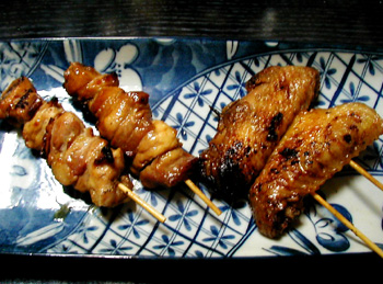 よみせ通りから、谷中銀座へ到着した頃にはかなり薄暗くなっていました。谷中銀座は日曜日が定休日が多いので、楽しみにしていた松阪牛のメンチは食べれませんでした、、、。すぐに焼き鳥の『コバヤシ』がありました。このお店は、土曜日や日曜日のまったりした時間に放送している、旅、グルメ、地域情報番組などにちらほら紹介されていて、気になっていたお店です。そして一番食べたかったのが、一串で鶏のいろんな部分が食べられる串(名前がわからない)。それが今回食べれるとテンションがあがってきました。が、、時間が遅かったのでほとんど売り切れ、2〜3種しか残っていませんでした。トホホ。で、上の写真をお買い上げ。