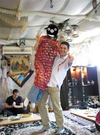 photo kamakura guruman 谷中散策つづき、イラン料理レストラン『ざくろ』にてしっとりとエキゾチックにランチしてるはずが、、、いつのまにかこの状態に。私はなぜ、赤い衣装を着て、抱き上げられ、ピースをしているのか,,,, いい思いでとしておこう。とにかく14時を過ぎた頃から、この店員さんが全てのテーブルに話しかけはじめ、全員に衣装を手渡し、肩車に、だっこと記念写真状態になっていきました。もちろんイヤな場合は断ればいいのでしょうが、早技で、、、ちなみに私は170cmの中肉なのでこの人かなり力持ちですよ。このお店に行かれる方は、覚悟の上で♪ ・イラン物産展 ・イラングルメ ・イラン産キャビア特集 ・イラン産『クミン』スパイス入りカレー ・イラン産ざくろドリンク ・イラン産 紅茶特集 ・ターコイズ調のアクセサリー ・プログラマーと旅人の石 ・ペルシアの布 ・イラン特産ガルバナムの入った香水 | 谷中銀座マップ | 過去のブログ一覧 | 鎌倉日記 | 音楽日記 | 鎌倉情報 | HOME |