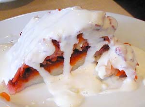 イラン料理レストラン『ザクロ』にて photo kamakura guruman これはデザート?「サラダです」「へ?」イランに行ったOさんが最初にトライ。「これおもしろい味がする!」おもしろい味とは、、ひんやりと冷えたその固まりに真っ白いソースがかかって、まるで、ケーキのようなサラダを一口、カレーの複雑な味に対し非常にシンプルでさっぱりとしている。1cmの長さに揃えられた千切り野菜、にんじんとピーツのようなものが入ってます。白いソースはヨーグルトベースのドレッシングソース?野菜自体のクセ、香りはほとんどなく、野菜ギライな人にはいいかも。深い味はありません。でもさっぱりしていて、このメニューにあると、バランスがいいかも。 料理はまだまだ続きます♪ ・イラン物産展 ・イラングルメ ・イラン産キャビア特集 ・イラン産『クミン』スパイス入りカレー ・イラン産ざくろドリンク ・イラン産 紅茶特集 ・ターコイズ調のアクセサリー ・プログラマーと旅人の石 ・ペルシアの布 ・イラン特産ガルバナムの入った香水 | 谷中銀座マップ | 過去のブログ一覧 | 鎌倉日記 | 音楽日記 | 鎌倉情報 | HOME | ||||||||