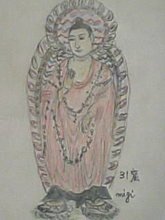 見た窟のなかで一番大きい。真中に説法のための台がある。天井に朱色の法衣をまとった千仏が描かれている。仏像は7立像、1坐像が残る。