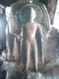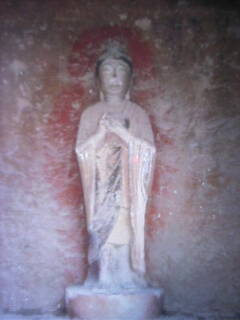 | 第10窟 観音像のような仏立像である。手は転法輪印(説法印)をむすび、後壁には頭光背光の朱色が残っている。お参りする人々に安らぎをあたえてきたことであろう、大きなまあるい顔が印象的である。 |