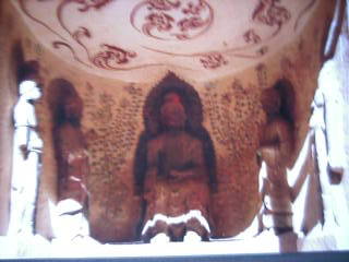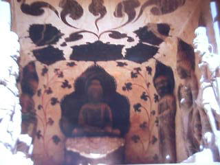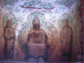 | 第22窟 五尊仏坐立像 裳懸坐に結跏趺坐する如来を中心にして二弟子、ニ脇待菩薩の五尊像であるが、ニ弟子の像は失われている。蓮の花の頭光の緑色と、壁の上ほどに浮ぶ蓮の茎に浮ぶ化生ニ仏が印象的である。 |