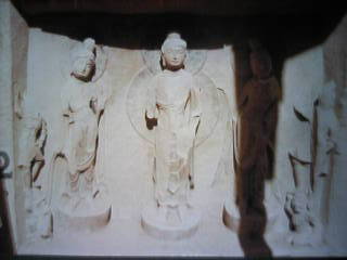 結跏趺坐する三体の仏像、そのあいだに双髷の脇待菩薩が立つ。