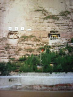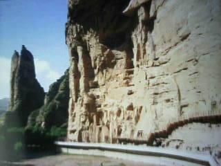 ボートの旅はすこぶる快適である。途中から湖面が黄色に変わり、両岸が迫ってくる。ここが劉家峡というところなのであろう。武陵源を凌ぐような奇岩がそそり立っていた。やがて断崖に炳霊寺という朱色の文字が見えてくる。右側の建物は道教寺院である。