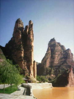 劉家峡ダムまでバスで約2時間かかる。道は険しい断崖の谷底を曲がりくねって登っていく。見上げると斜面は真っ青な空を突き刺す頂きへと続き、今にでも地すべりを起こし崩れてくるような無数の亀裂が横に走りっている。その模様は人が切り開いた九十九折りの山道のようにも見える。道は峠を越え下りとなった。急な斜面に人家が見えはじめ、ようやく劉家峡水庫(ダム)に到着した。このダムは黄河最上流のダムであり水は青く澄んでいた。澄んだ黄河を見たのははじめてである。