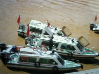 7人乗りのモータボートに乗りダム湖の上流にある炳霊寺へ向う。ダムは黄河の水を満々とたたえている。ダムの両岸は遠くに険しい峰峰が連なり紅い帯のような断崖が湖面に落ち、空には白雲がわき峰を覆っている。