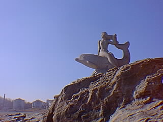 毛皮模様の断崖がそそり立っている。海水浴場の星海公園はシーズンオフで人影がまばらである。イルカ