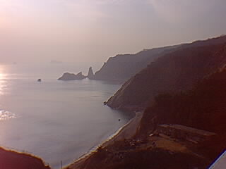 こめ波頭がきらめいた。5時間半ばかり過ぎてやがて靄のなかから陸地が見えてきた。蓬莱閣の建つ断崖