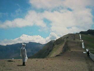 | 国境は一本の杭と白い柵で中国と朝鮮を分けていた。中国側の山頂は狭く観光客がごったがえしていた。なぜかこの白い柵が倒れ観光客はこの柵の内側(朝鮮側)の断崖のへりまで進み素晴らしい眺めを堪能していた。しばらくする監視員の注意で観光客は中国側へ推し戻され倒されていた柵が立てられた。このとき観光客の中にいた私も正式には朝鮮へ行ったことにならないが、朝鮮の土を踏んだことにはなったのであった。 |