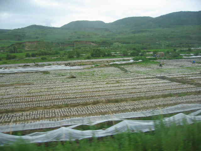 車窓から眺める田園風景は美しい。やがて白い筒を一面に敷き詰めた見慣れない畑が見え始めた。これはキクラゲの栽培をしているのだそうだ。このあたりはキクラゲの栽培が盛んであるようだ。