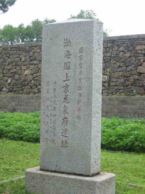 宮城南門の石垣を積んだ台基の前に立つ石碑に上京龍泉府遺跡と書かれている