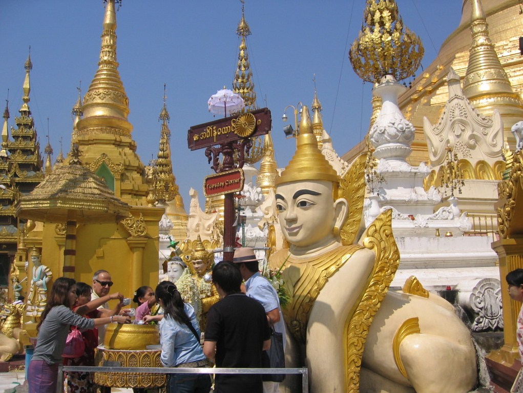 ミヤンマー仏教の総本山シュエダゴン・パゴダ、周囲433mの基底に高さ99.4mの黄金の仏塔が聳え立つ、ここで記したいのは仏塔の周りにまつられている八つの祠についてである。ミヤンマーでは伝統暦として八曜日があり、自分の生れた誕生日の曜日が重要視される。この写真は仏塔の南東に設置されたライオンを守護動物とする火曜日の祠である。火曜日生れの人々が祠に水をかけ花や蝋燭、線香などを供えている。