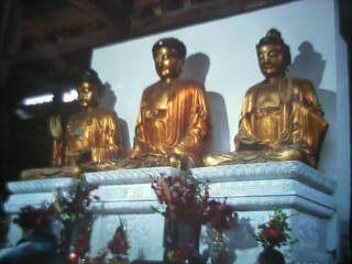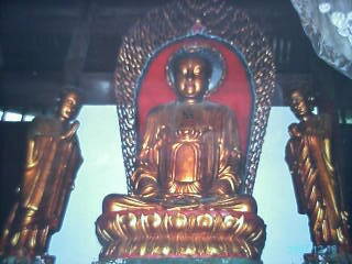 五百羅漢道場と言われている下方廣寺は東晋の創建で古い歴史をもつ。大雄宝殿は清代に再建されたもので屋根の先が弓のように曲り天を向いている。中央で黄金色の釈迦像が蓮華坐に座り、両端のニ弟子もこれまた金色である。出口の左右に弥勒菩薩と文殊菩薩が座り通りぬけるものたちを慈悲の眼で観ている。また両側の棚は五百羅漢像がびっしりと並んでいる。