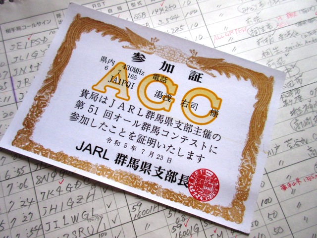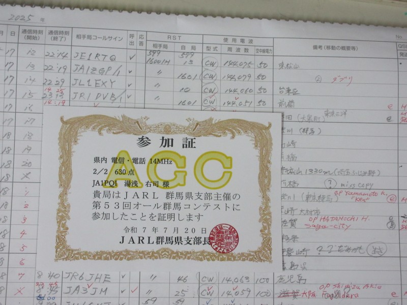 フレンド局とのアイボールと2025年オール群馬コンテスト参加証受領