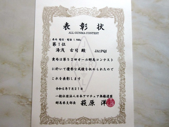 7月21日 ALL群馬コンテスト 1。9MHzバンド電信電話部門 1位入賞