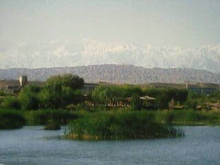 午前の光線を斜めに受けて祁連山の峰峰は神々しく耀いて見える。この気高い峰峰がなければこの池に水がたたえられることもなく、このオアシスの町の存在すらないのだ。