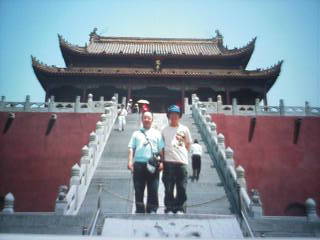龍亭 龍亭は清代に再建された建物である。午門をくぐり中山路を歩いていくと左右に楊家湖、潘家湖がひらけ涼しい風が湖面から吹いてくる。正面の朝門をぬけると中央に雲龍の浮彫りを施した70段ほどの石段が続きその真上に龍亭が天に向ってそそり立つ。階下より見上げると相当な威圧感がある。台に登り楼閣に入るとロウ人形により宋朝開基の式典の模様が再現されている。また台上からの眺めはすばらしい。潘家湖、楊家湖や開封の街並を見下ろしていると、天安門で建国を宣言する毛沢東の映像が脳裏に浮んできた。 |