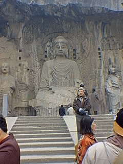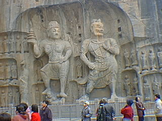 龍門石窟は洛陽市南郊外12.5キロメートル、伊河の中流を挟んで両岸に開けている。ここを最初に訪れたのは今から10年前の1996年12月であった。伊河にかかるアーチ橋の龍門橋、石窟の入り口の石門や河畔の柳並木は以前と変っていなかったが、今は広い駐車場が用意されショッピングセンターや電動バスなどが出来て大勢の観光客が受け入れ可能となっている。前回、12月のどんよりと曇った龍門は、今回は5月の日の光耀くもと、伊河水碧にして琵琶峰青く 春風に柳枝なびき白壁に仏窟無数。