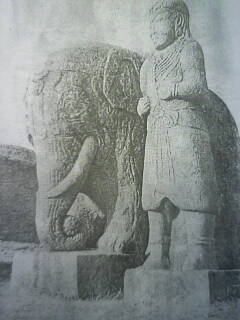 神道の石刻群 神道の石刻群は、望柱、象と像使い、瑞禽、角端、馬輿控馬官、虎、羊、客使、武将、文官などが整然と並ぶ。左は像と像使いである。 |