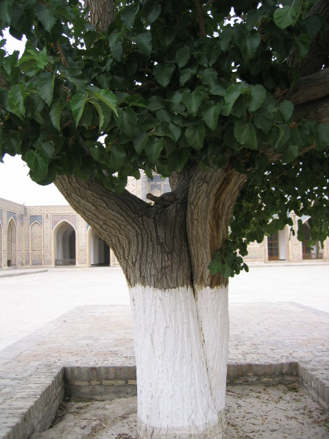 外国で桑の木を見たのは中国新疆ウイグル自治区のトルファンが最初であった。私が高校時代までは田舎では養蚕が盛んで桑畑は近場に多く見られた。だから桑の木自体はめずらしいと感じないが、トルファンのそれはは大木で圧倒された。しかし、今回ウズベキスタン会見した桑の古さといい大きさといい、数の多さといいトルファンをはるかに上回るものであった。