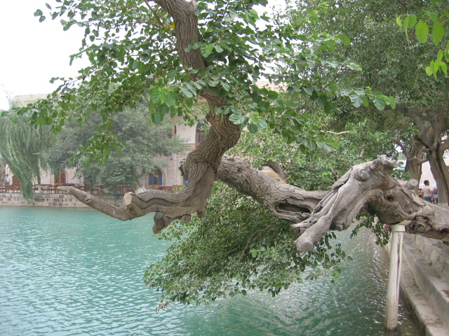 広場の桑は巨木が多い。リャビ・ハウズは池の岸辺という意味でここには古い人工の池がある。ブハラのひとびとが水をくめるよう石段が設けられている。ひとびとが憩おっている広場を通りぬけて睫毛が長く目玉が黒い女の子が白い桑の実を拾い集めた籠を両手で抱えて家路を急いで帰っていった。